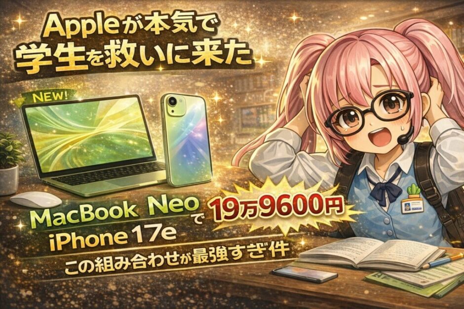 ちょっとてんちょぉ〜! Appleが学生のために本気出してきましたよ! MacBookもiPhoneも最新で、しかも合計20万円以下!? これ、去年だったら絶対ありえなかったことだと思います!