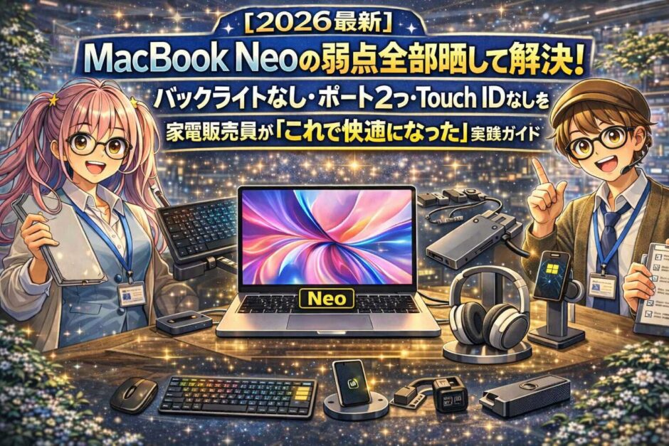 本記事掲載の価格は2026年4月時点の参考価格です。MacBook Neoのスペック・価格はApple公式サイト(2026年4月時点)を参照しています。Apple Watchでのロック解除機能はApple公式サポートを参照。価格・仕様は変動します。購入前に各ショップ公式サイトで最新情報をご確認ください。