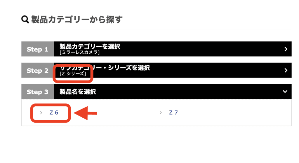 今回はZ6のアップデートをしたいので、「ミラーレス」→「Zシリーズ」→「Z6」の順で進んでいく。