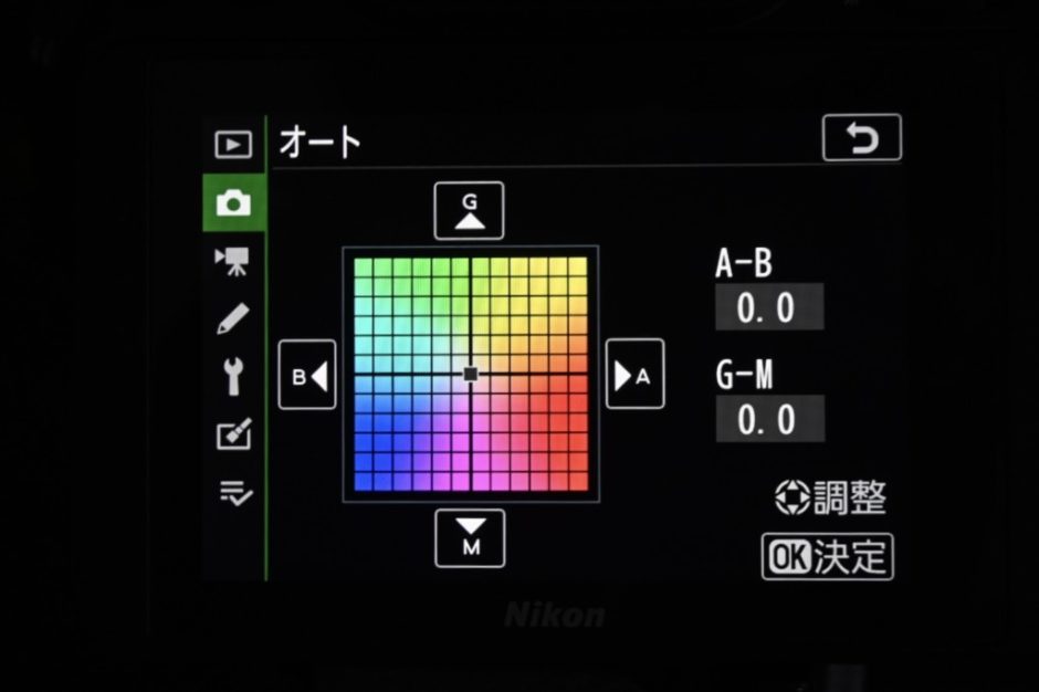 ニコンの場合のホワイトバランスの微調整は■印を上下左右に動かして、好みの色を作ることができます。