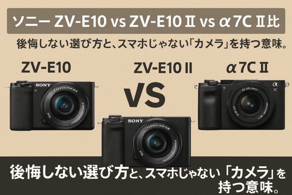A. 「明るい場所での動画メイン」ならZV-E10 II。「暗所撮影や、10年後も使う本格カメラ」ならα7C II。価格差約15万円は、センサーサイズとボディ内手ブレ補正への投資です。